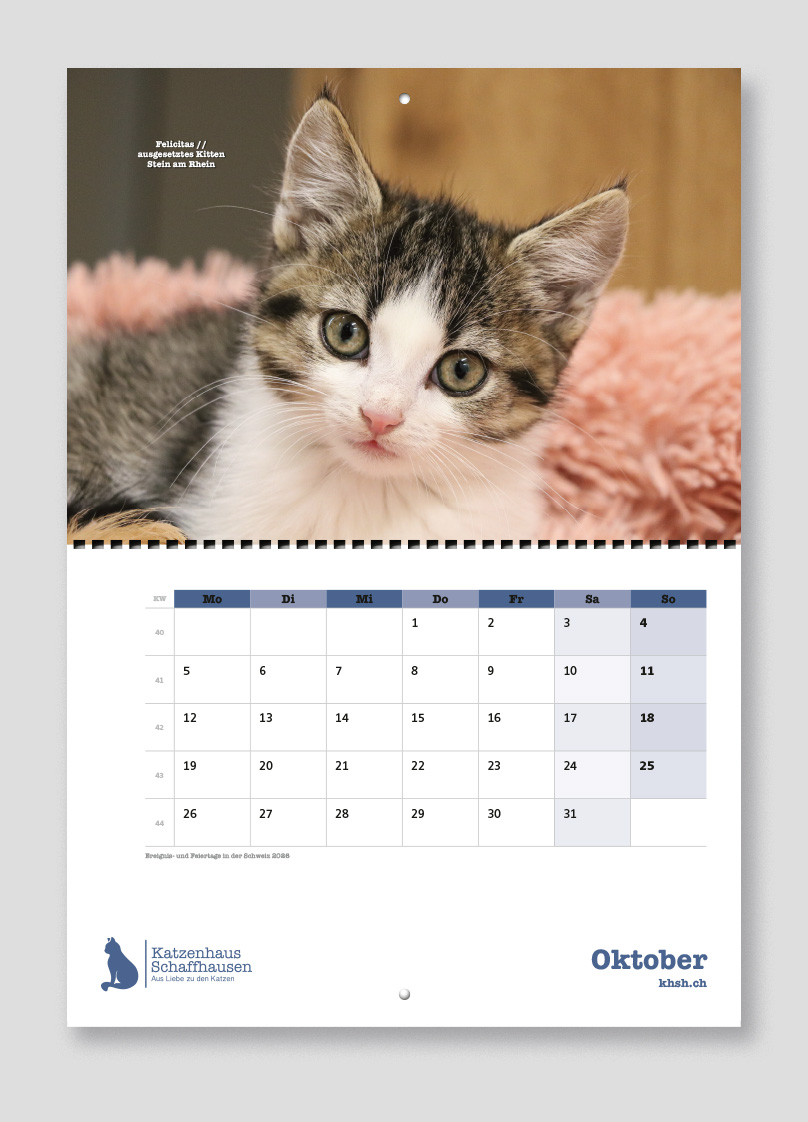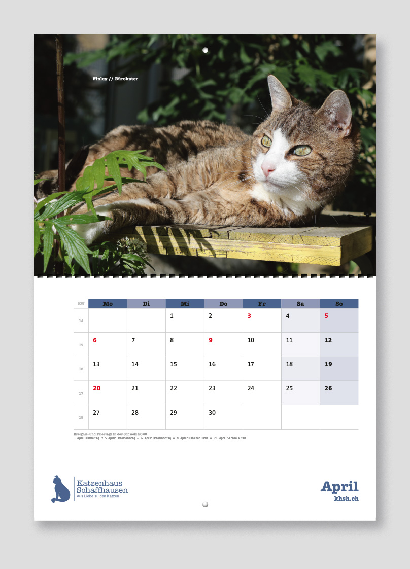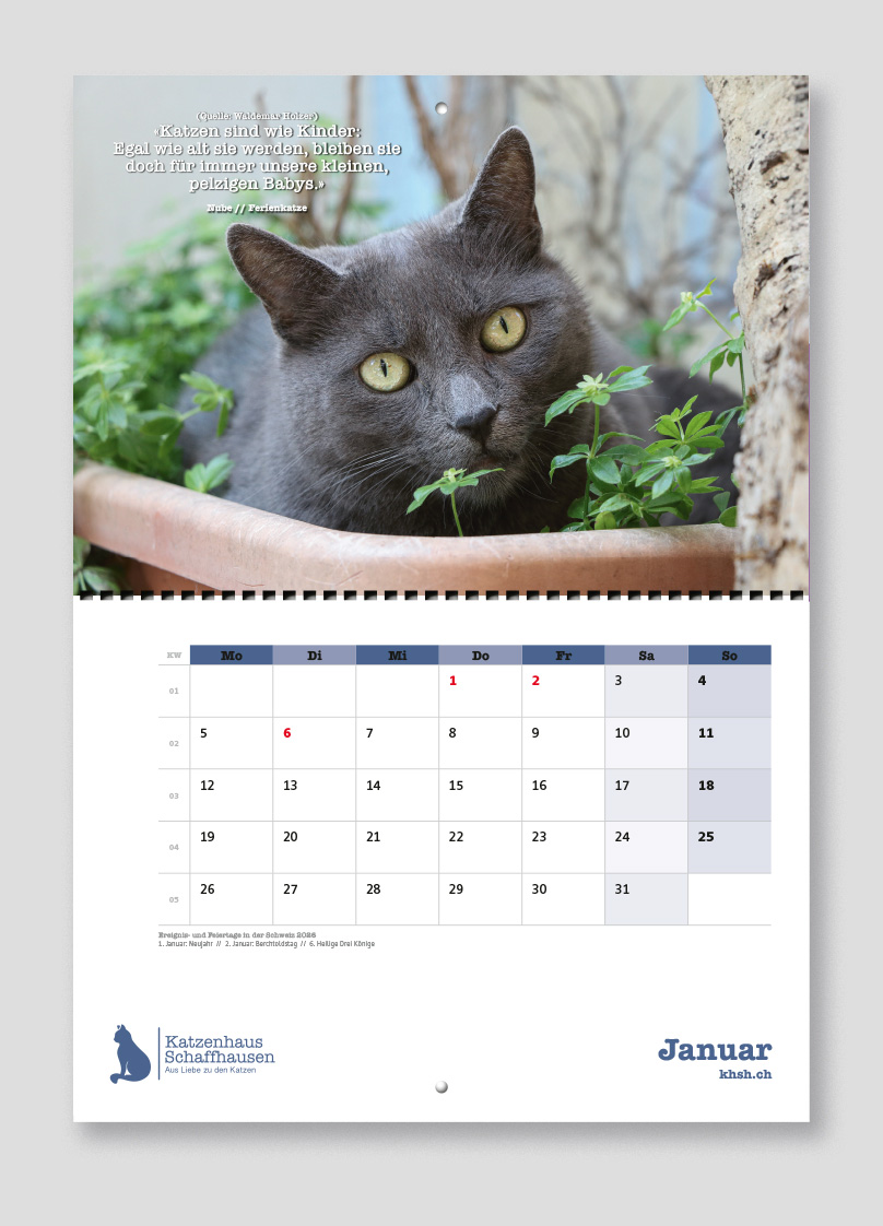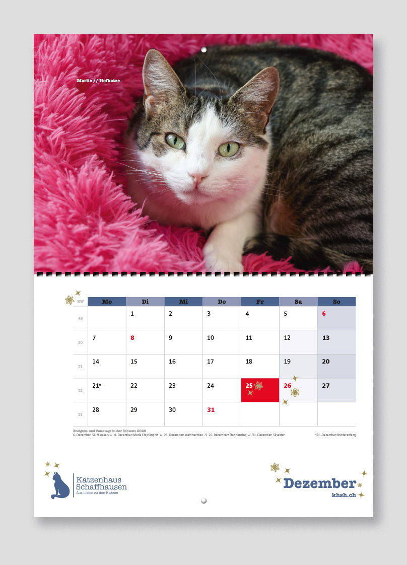Mit dem Kalender verschenkt ihr nicht nur Freude für ein ganzes Jahr, sondern unterstützt gleichzeitig einen guten Zweck: Der gesamte Reinerlös fliesst direkt in die Versorgung unserer heimatlosen Katzen.